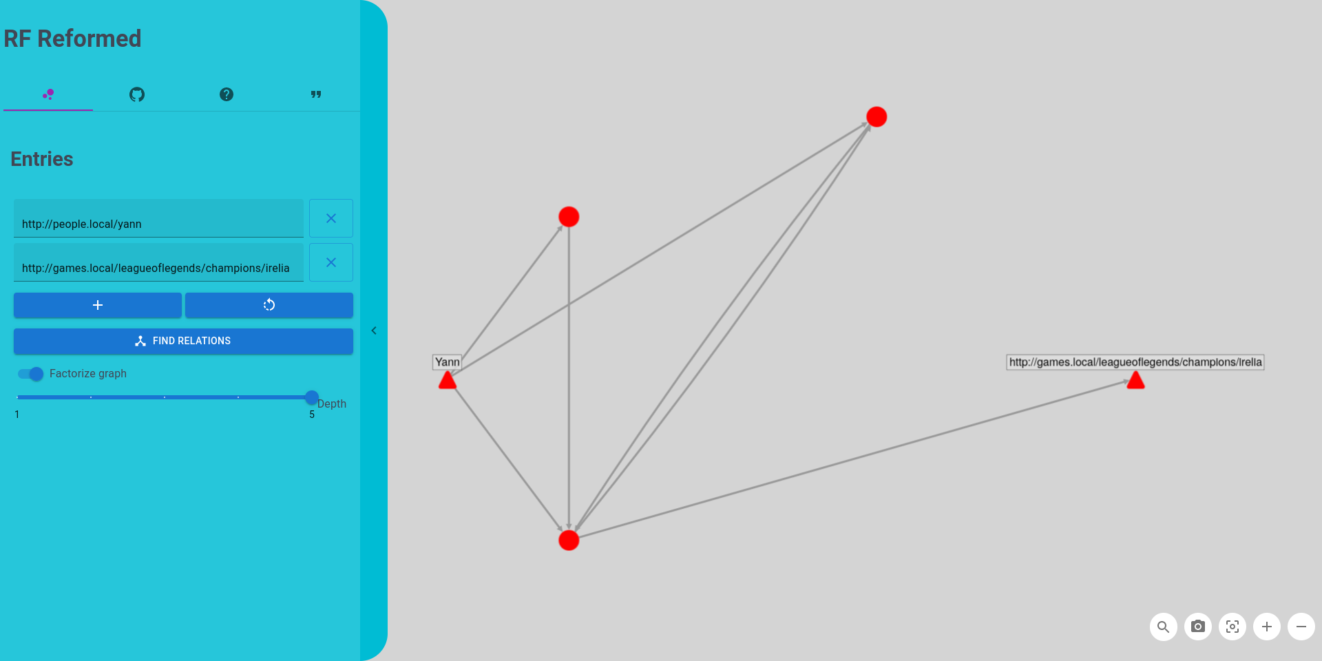 RFR is an attempt to recreate a maintain a web Application named Relfinder which was used to determined the relations between two entities in a RDF knowledge graph. First made to replace the Relfinder instanced used by the AgroLD platform, I made it OpenSource and as agnostic as possible so the semantic web community could use it.