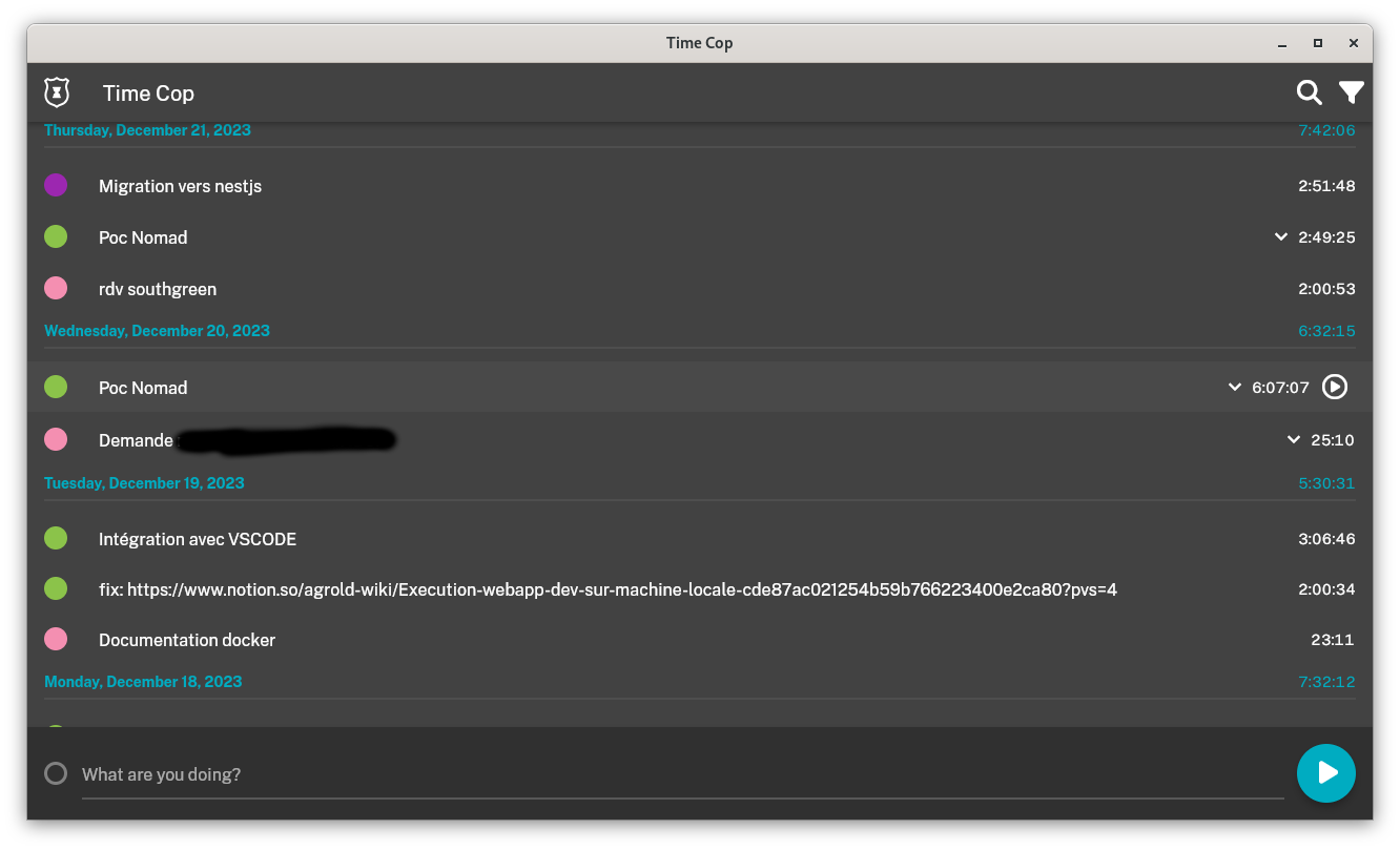 This project aims to provide an online hosting, synchronisation and integrations of a project named timecop, an offline-first time tracker that I regularly use. This app allows you to register the time you spent on tasks related to projects, however it becomes cumbersome when you want to synchronize your timers across several devices, moreover it could have some interesting integrations with managing solutions like Jira, Notion and so on. This project is some kind of sandbox on which I experiment new languages like elixir and try to apply what I learned through my DevOps courses.